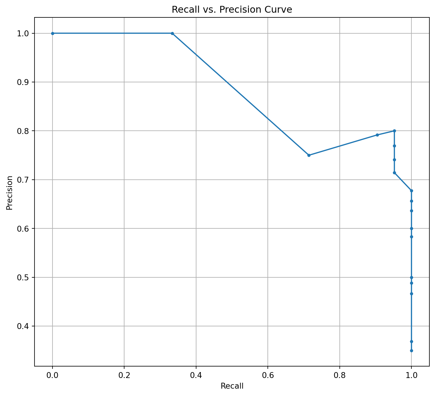 # Calculate precision and recall values for each classprecision, recall, thresholds = precision_recall_curve(y_test, rf_model.predict_proba(X_test)[:, 1], pos_label=1)# Plot the recall vs. precision curveplt.figure(figsize=(9, 8))plt.plot(recall, precision, marker='.')plt.xlabel('Recall')plt.ylabel('Precision')plt.title('Recall vs. Precision Curve')plt.grid(True)plt.show()plt.clf()plt.close()plt.show()
