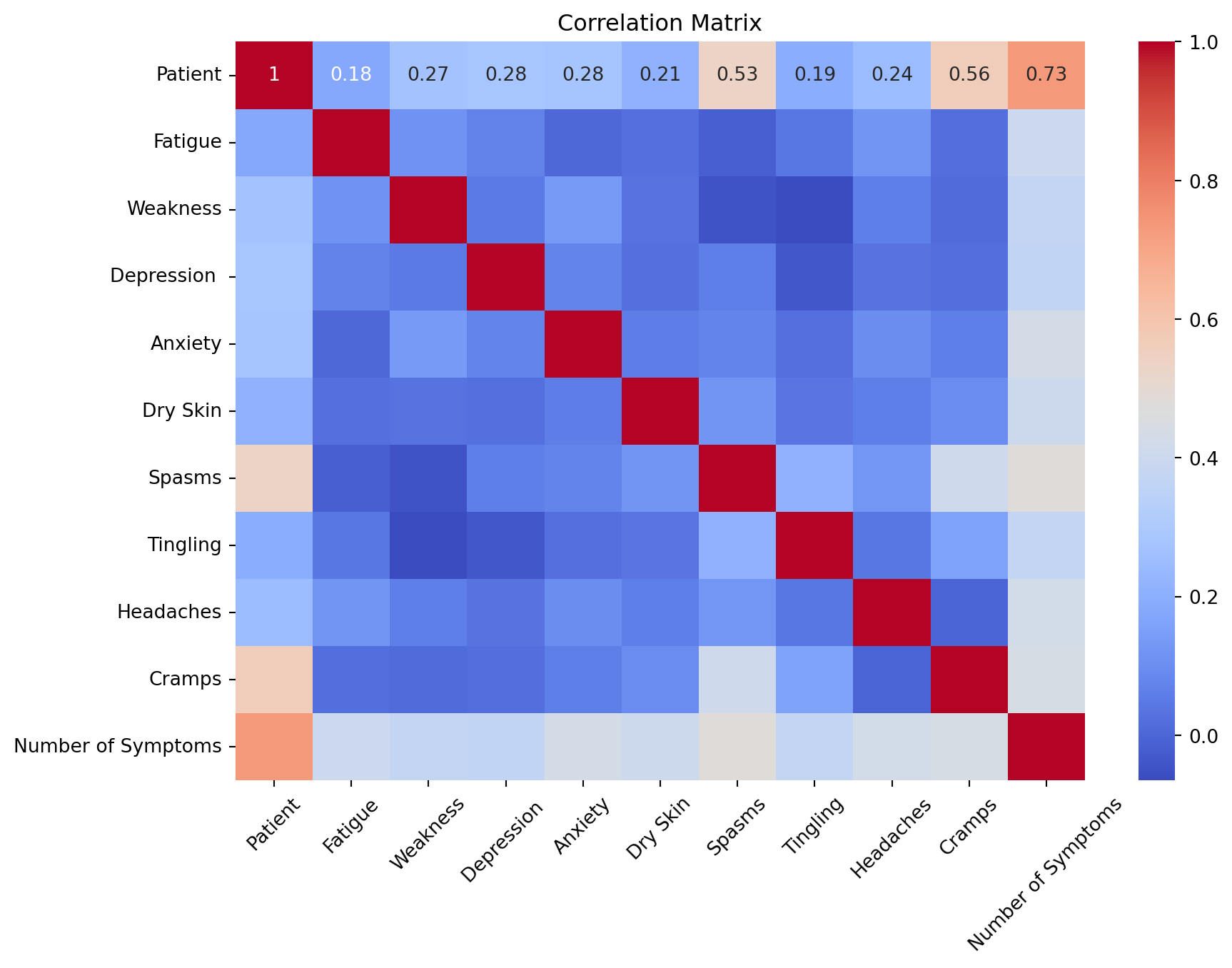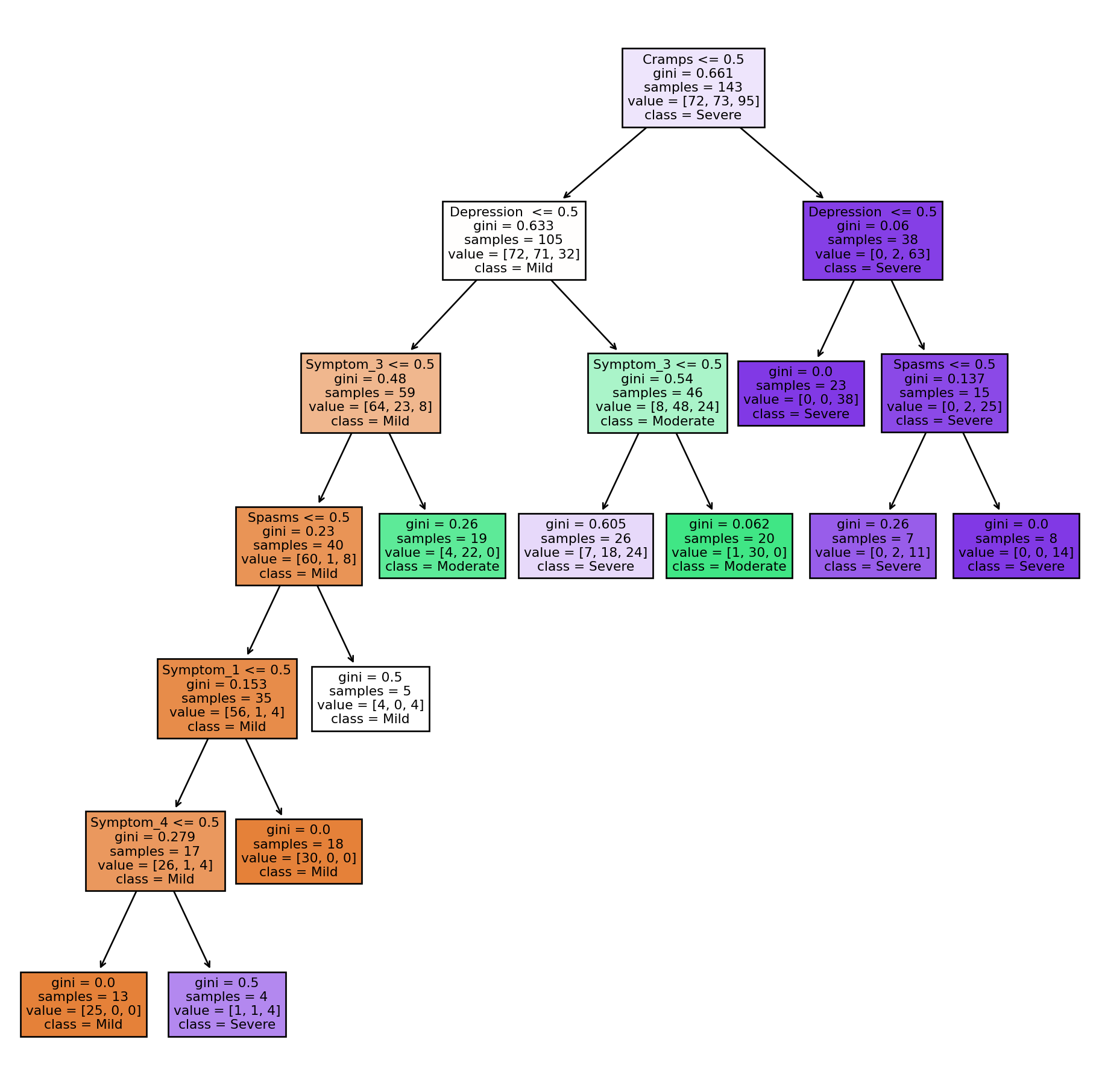 Given this information, another threshold can be established. It can be inferred that if a patient has at least 3 symptoms and/or has depression and/or cramps, they can be classified as “Moderate.” This is addressed with the model later in the study.