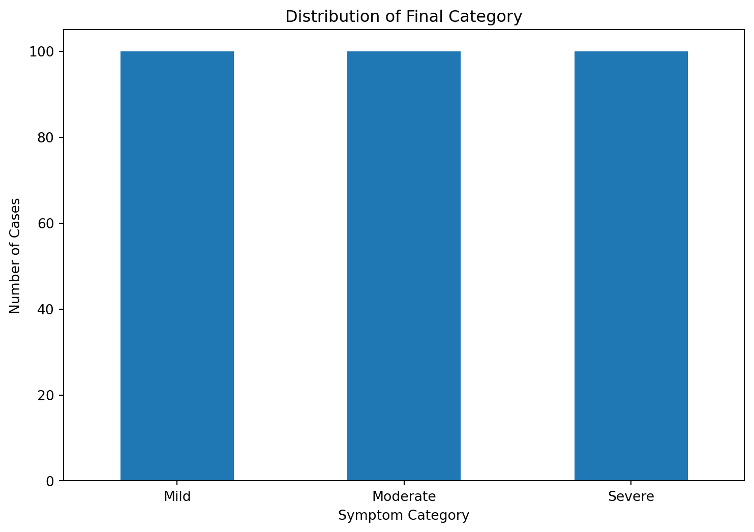 # Visualize the distribution of the target variable 'Final Category'plt.figure(figsize=(9, 6))ds['Final Category'].value_counts().plot(kind='bar')plt.xlabel('Symptom Category')plt.ylabel('Number of Cases')plt.title('Distribution of Final Category')plt.xticks(rotation=0) # Set rotation to 0 degrees for horizontal x-axis labelsplt.show()plt.clf()plt.close()plt.show()