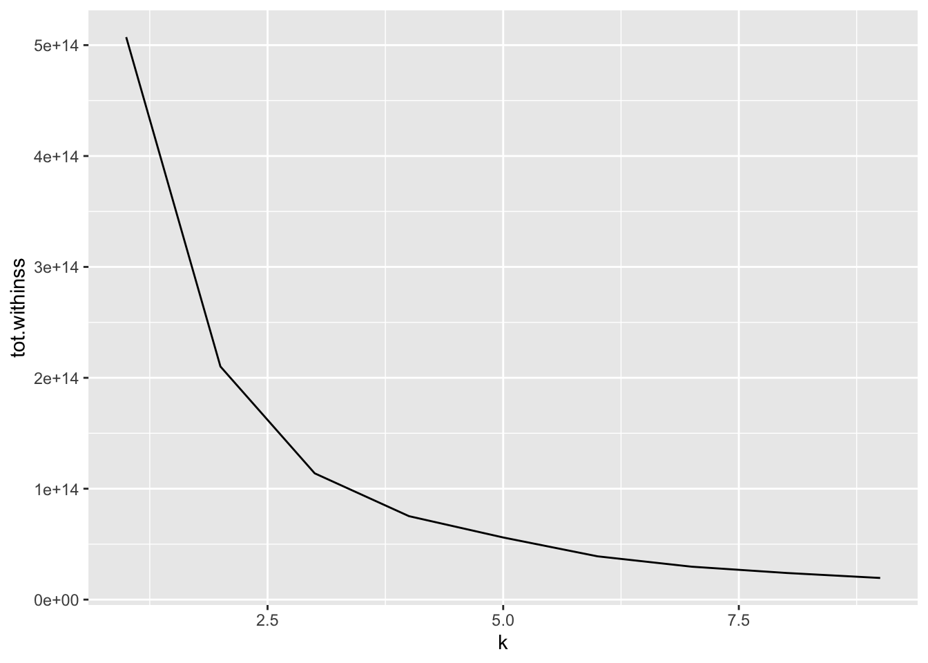 ggplot(clusterings, aes(k, tot.withinss)) +